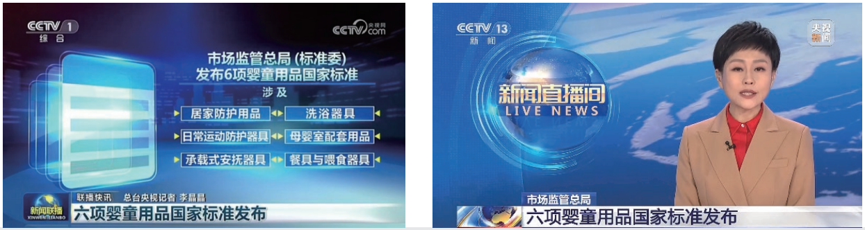 2023年“六一”期间,《新闻联播》和《新闻直播间》等中央电视台栏目以及《光明日报》、《中国质量 报》、《中国政府网》、《工人日报》等各大新闻媒体对我院主导和参与制定的这6项婴童用品国家标准进行了 广泛和深入的报道,引起了社会和业界的热烈反响。这批标准的发布实施,将进一步完善我国婴童用品标准 体系,促进我国婴童用品的质量提升,为婴童创造高质量的成长环境